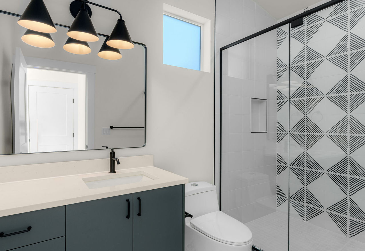 The ADU offers 1,131 sq ft with 2 bedrooms and 1.75 bathrooms. Its unique stacked-flat design sits above the SFR’s garage, giving it both privacy and connection. Inside, black-finish hardware complements quartz countertops, LG appliances, and durable LVP flooring. A dedicated parking pad with EV-capable wiring provides added convenience.